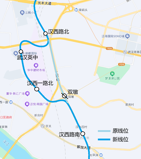 据2026年4月1日武汉地铁官方宣布,为提升站点密度,扩大地铁站点覆盖率,武汉地铁决定将12号线江北段进行线位调整。其中,原先设在建设大道和汉西路交叉处、和3号线换乘的双墩站,现更改位置至西北方向800米处的汉西三路上,并另取站名“武汉英中”站,汉西路南至汉西路北站区间亦更改线位,沿汉西路→建设大道→汉西一路→汉西三路方向铺设。另在汉西一路和汉西三路交叉处增加新站点“汉西一路北”站,以适配周边居民区和该居民区内的重要生活物资采购地——山姆会员超市之间的大量通勤客流。